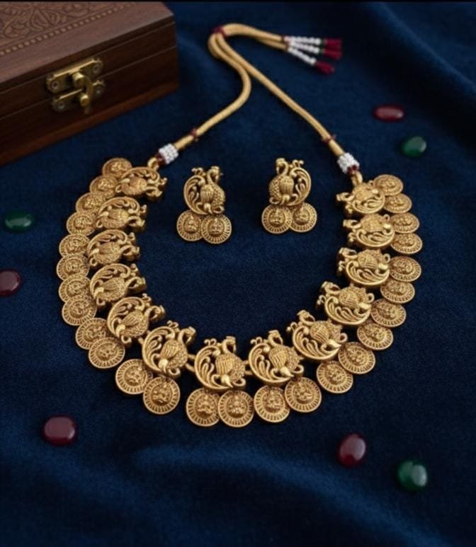 The antique gold finish adds richness and heritage appeal, making it a perfect statement piece for weddings, festive occasions, cultural events, and family functions. The matching earrings combine the same peacock and coin design, completing the ethnic charm of the set.