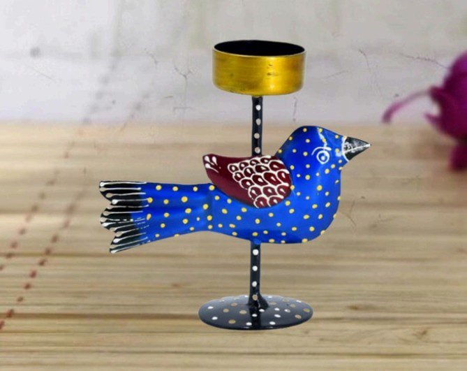 Crafted from sturdy yet lightweight metal, this decorative tea light holder is both functional and beautiful—perfect for setting warm ambience during festivals or enhancing your regular interior décor. Its unique design, featuring a colourful bird perched elegantly on a metal stand, gives it a handcrafted appeal ideal for lovers of artistic décor.