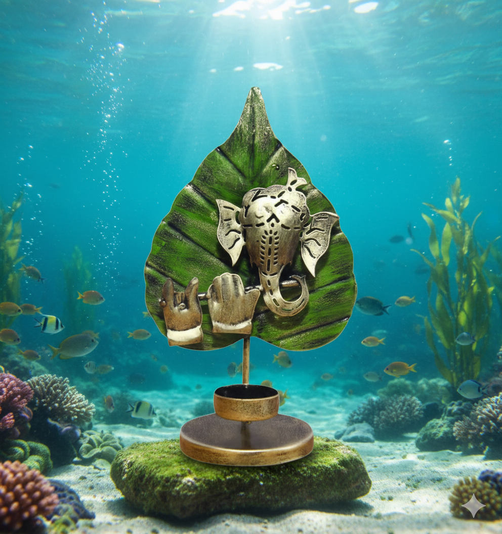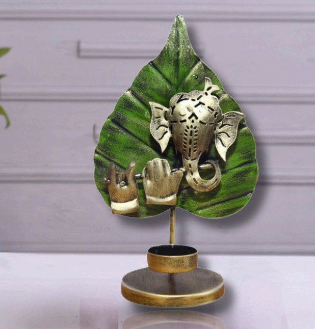Add a divine and artistic charm to your home with this Green Patta Brass Ganesha Tealight Holder from Indihandmades.