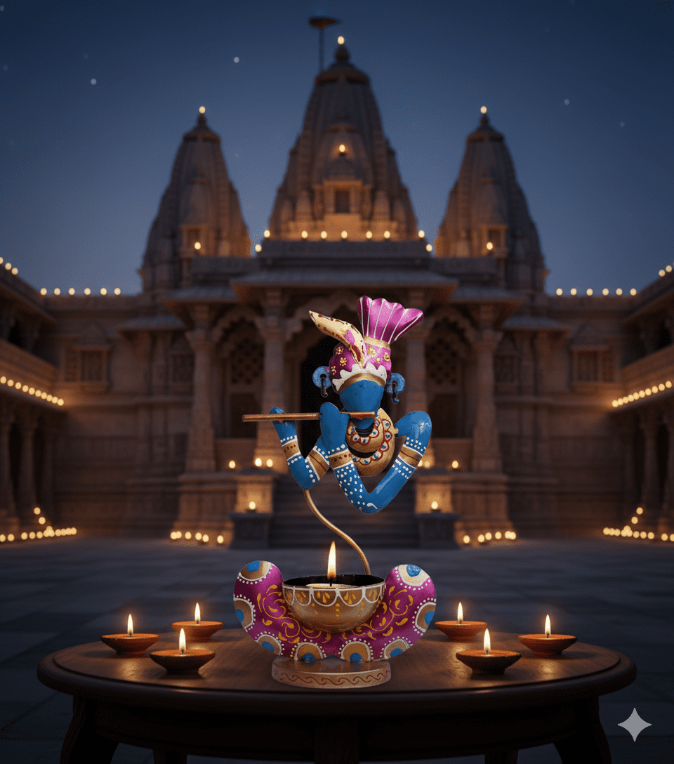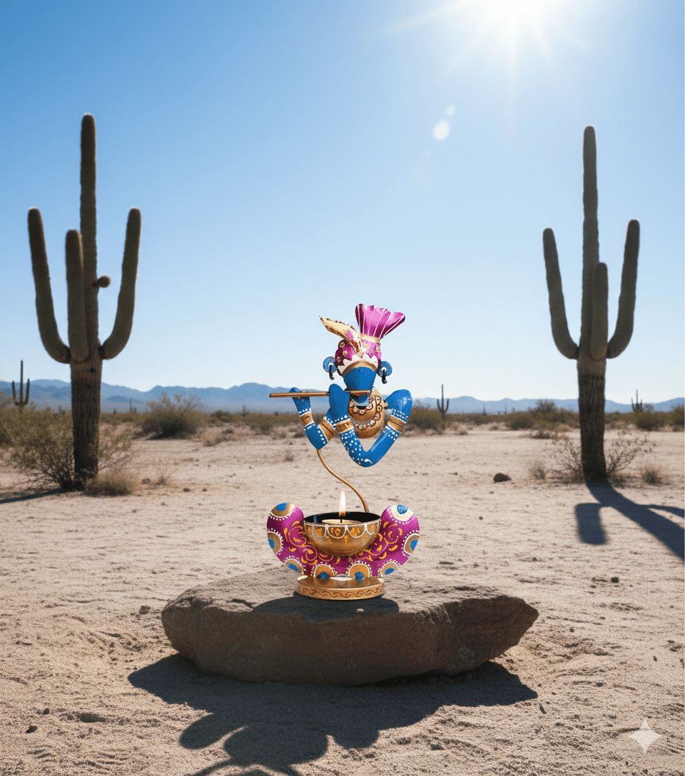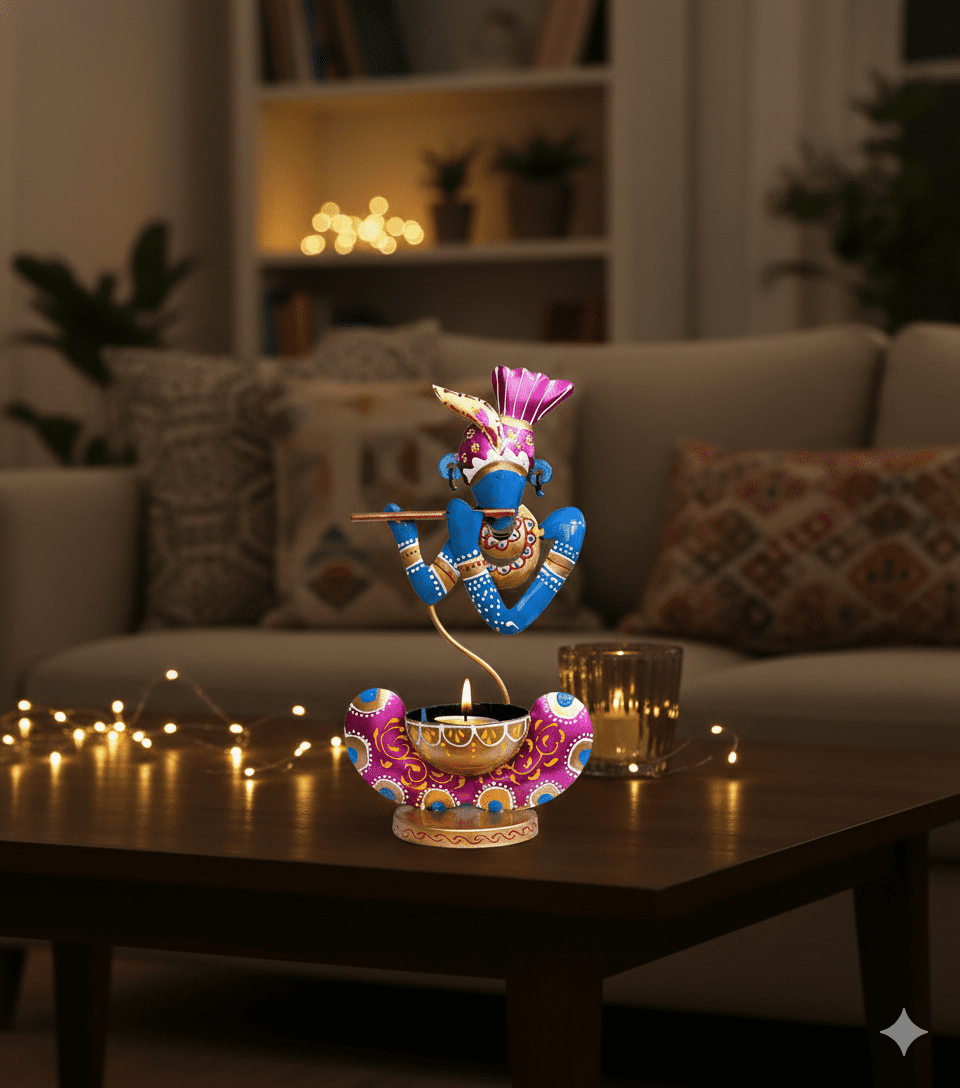 Bring traditional elegance and artistic vibrance to your home with this Handcrafted Rajasthani Metal Krishna Tea Light Holder by Indihandmades.