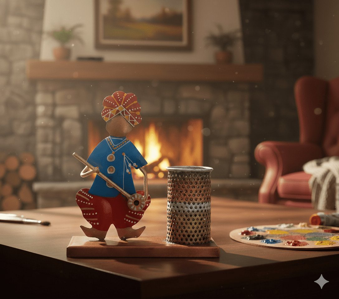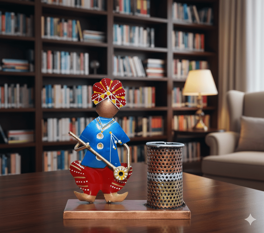 Add a splash of culture and colour to your workspace with this Handcrafted Rajasthani Musician Metal Pen Stand from Indihandmades.