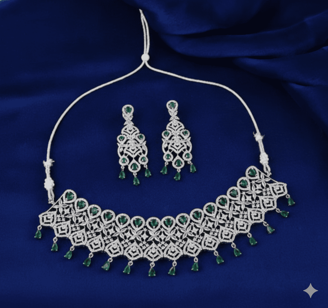 The necklace showcases a symmetrical, intricately woven silver structure embellished with sparkling diamond-cut details. Each section is adorned with teardrop-shaped green stones and delicate bead danglers that create a captivating movement. Matching earrings complete the set, featuring an equally elegant macrame design, making it a perfect coordinated accessory for festive occasions, weddings, engagements, sangeet, parties, or gifting.