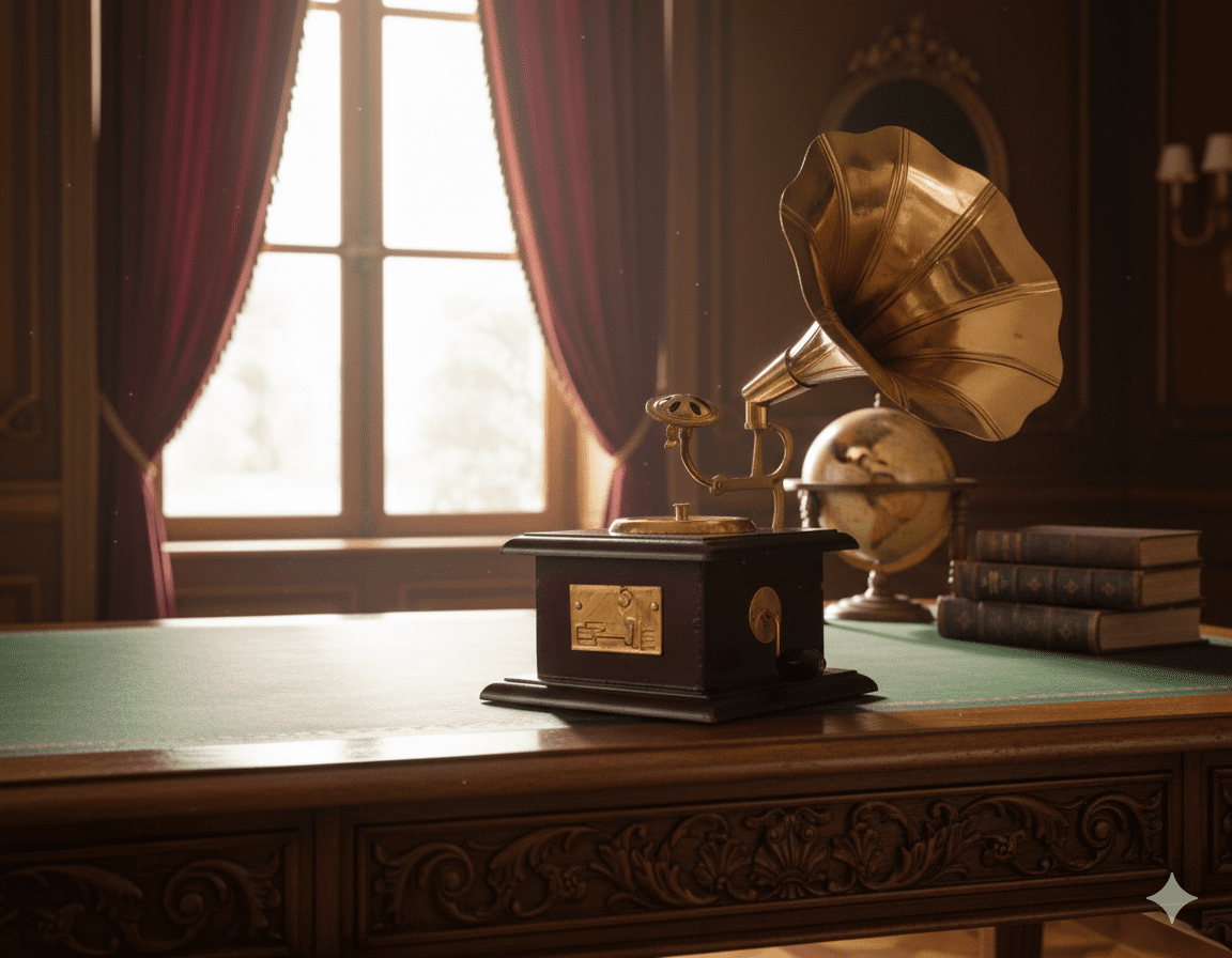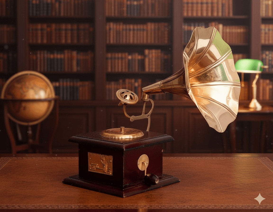 This beautifully detailed piece features a polished golden horn, artistic metal components, and a classic wooden-finish base—perfectly capturing the charm of old-world musical instruments.