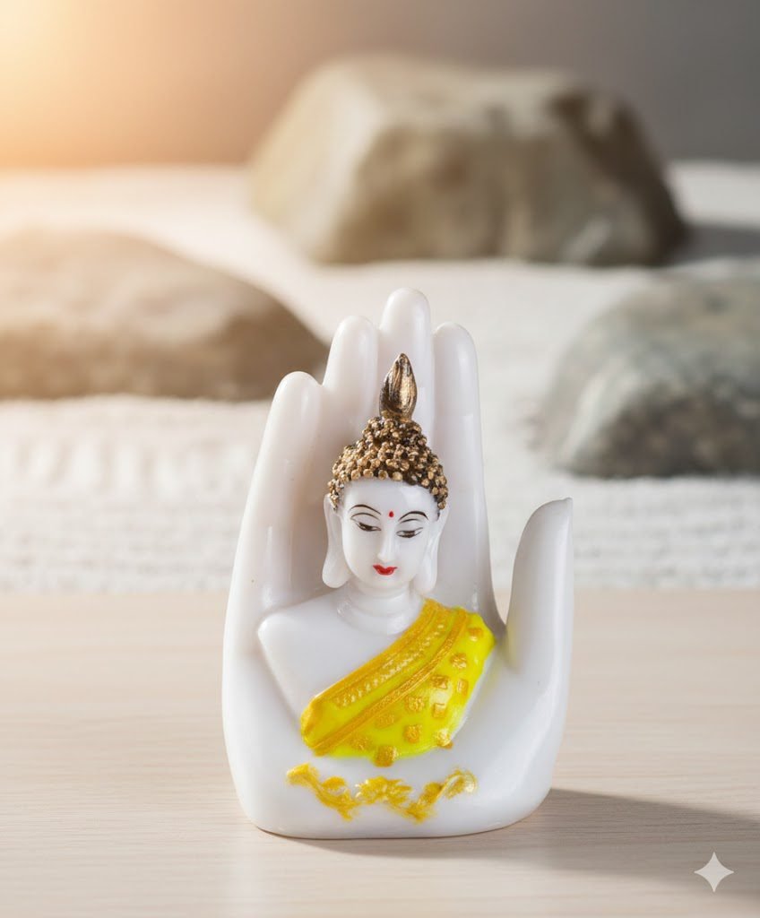 Add a touch of peace, inspiration, and elegance to your home with the Indihandmades White & Yellow Buddha Palm Idol, a beautifully crafted resin décor piece designed to uplift any indoor space. This striking statue features Buddha’s serene face embraced within an open palm, symbolizing divine protection, blessings, and guidance.